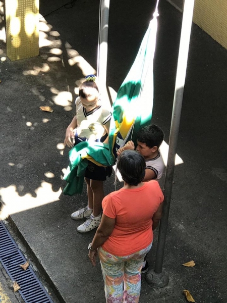 Todas as segundas-feiras nossos funcionários e alunos se reúnem, antes do começo das aulas, para homenagear a nossa pátria, entoando o Hino Nacional.