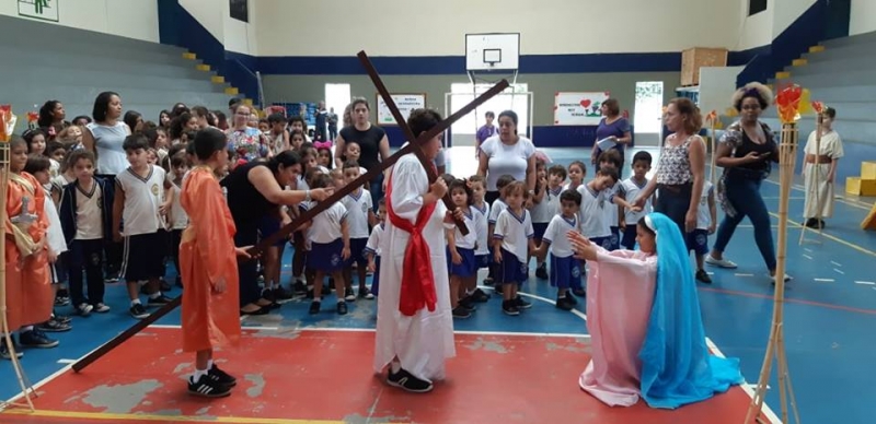 Foi realizada no dia 17 de abril na Escola Padre Butinhá a Via-sacra. Participaram os alunos da Educação Infantil e Ensino Fundamental I (1º e 2º Turno). A “Paixão de Cristo” foi rememorada e a emoção tomou conta de todos.