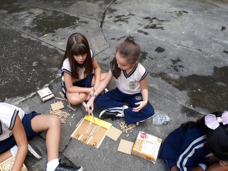 As primeiras atividades sistematizadas propostas com o material dourado, e sua representação em papel, têm como objetivo fazer com que o aluno perceba as relações entre as peças e compreenda as trocas no Sistema de Numeração Decimal. Trabalho realizado pela professora Elizangela com o 2° ano, turmas 201 e 202.