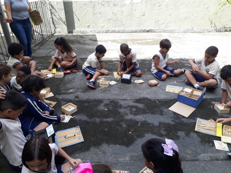 As primeiras atividades sistematizadas propostas com o material dourado, e sua representação em papel, têm como objetivo fazer com que o aluno perceba as relações entre as peças e compreenda as trocas no Sistema de Numeração Decimal. Trabalho realizado pela professora Elizangela com o 2° ano, turmas 201 e 202.