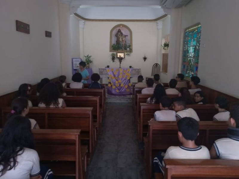 Os alunos do 6º ano (turma 601), fizeram sua reflexão da Quaresma relembrando as estações da Via Sacra. Através de uma caminhada pela escola, foram levados a meditar sobre a importância dos temas abordados pela Campanha da Fraternidade 2019. Os alunos juntamente com as professoras Geise (Educação Religiosa e Empreendedorismo), Selma (Língua Portuguesa) e Ir. Azucena (Pastoral Escolar), venceram vários obstáculos para chegar à capela, uma metáfora mostrando as dificuldades que podem encontrar na vida e que serão vencidos com esforço e fé.